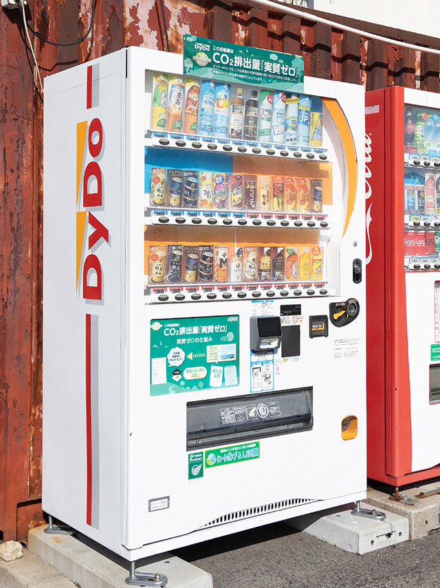 当社倉庫入口には、CO2排出量「実質ゼロ」の自動販売機を設置しています。